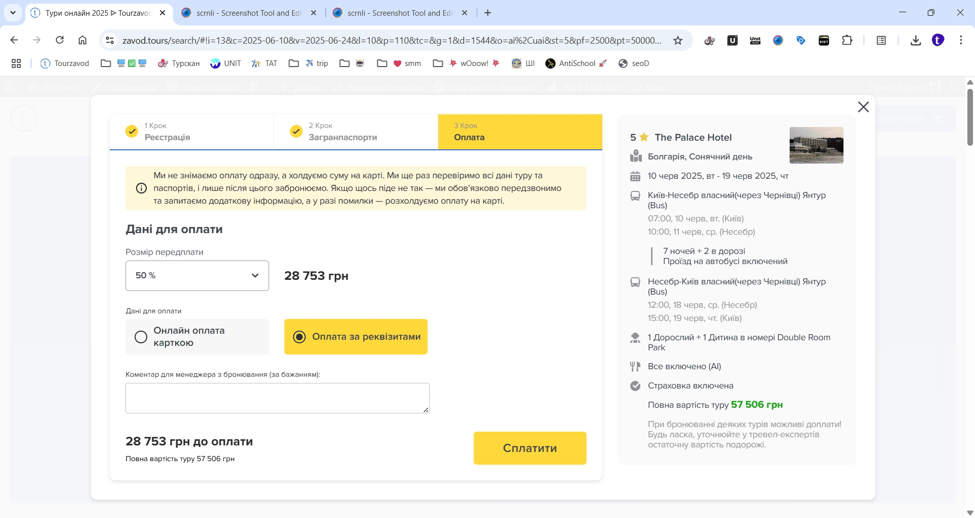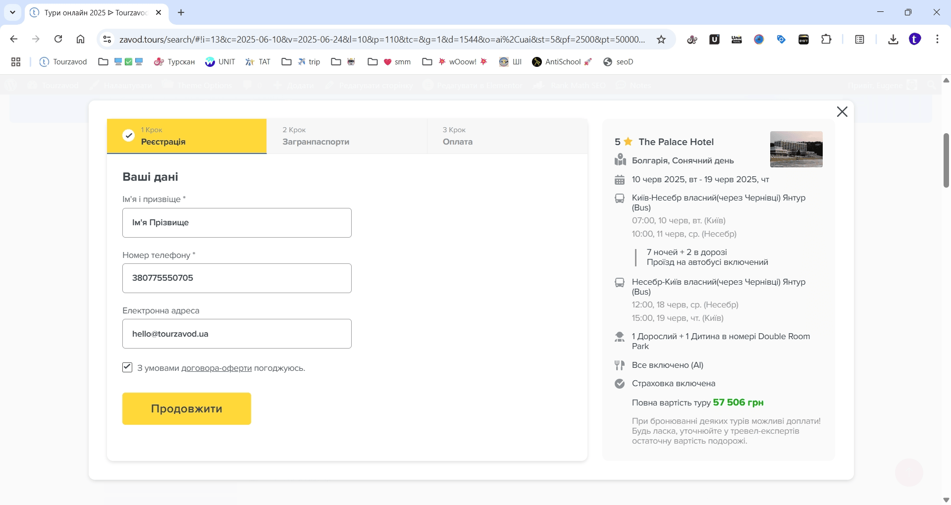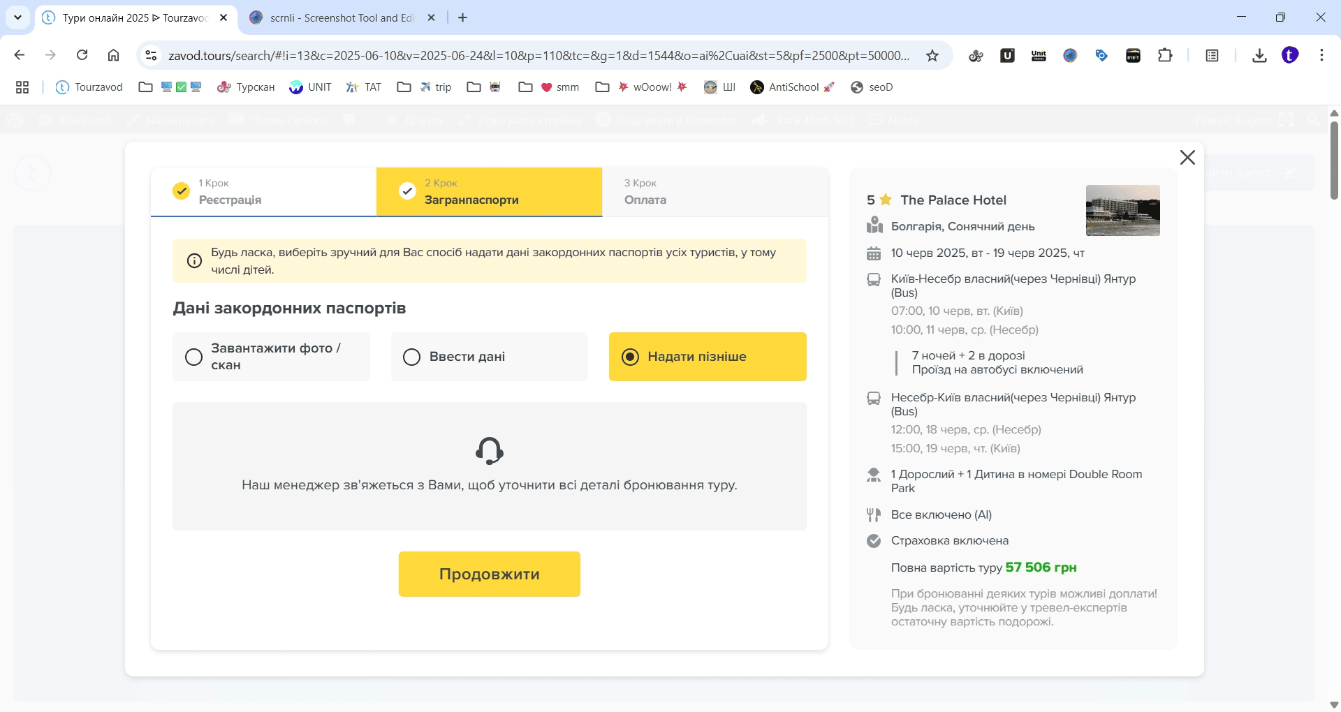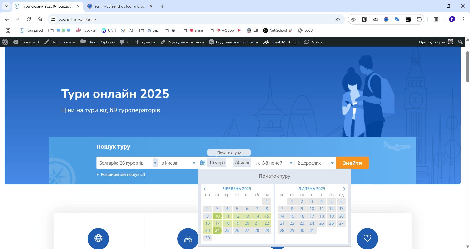 Супер! Пошук туру почне перевіряти туроператорів України на наявність місць на рейсах і в готелях, визначить саму мінімальну вартість і покаже результати пошуку. Зазвичай пошук туру займає від 30 секунд до 1 хвилини.