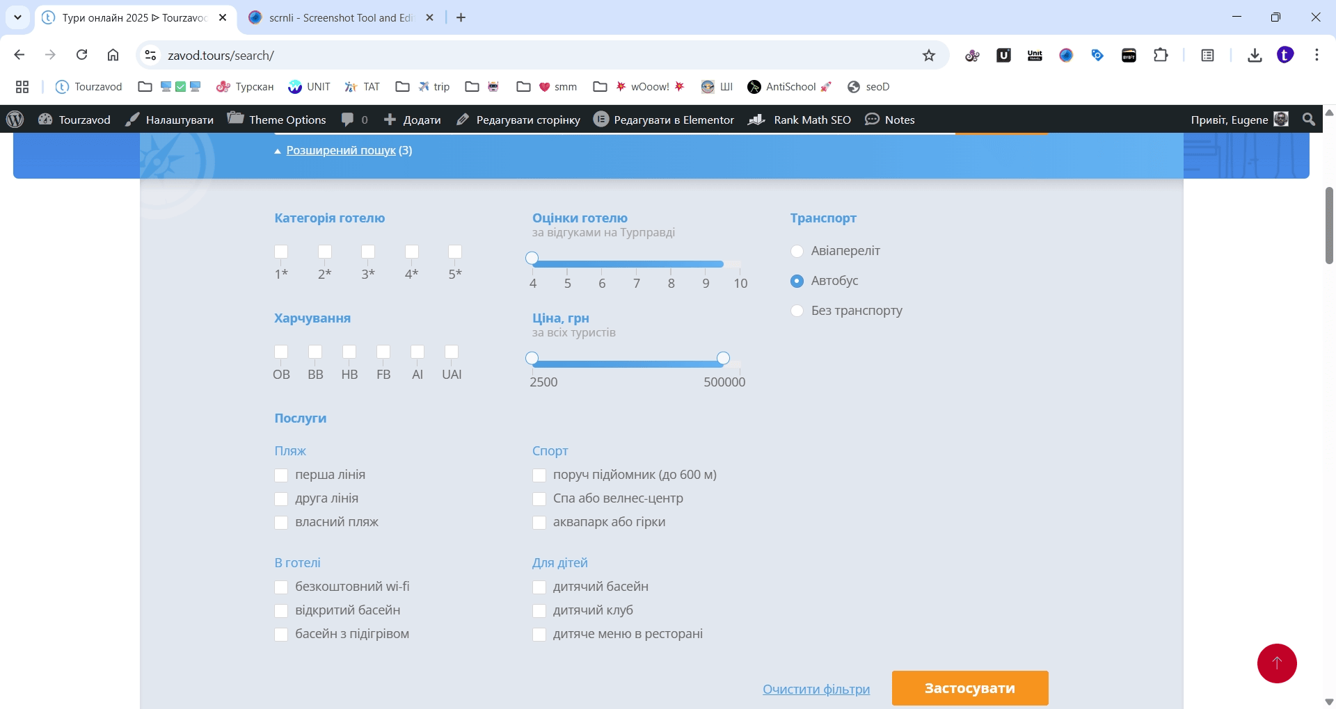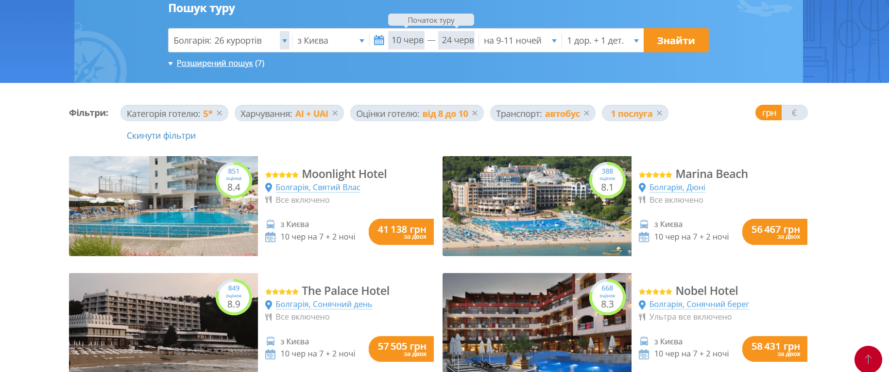 Скористайтеся фільтрами для уточнення підбору туру. Сортування допоможе більш конкретно вибрати категорію готелю, тип харчування, послуги в готелі, а також відсіяти вибір за ціною туру. Зверніть увагу на рекомендації та відгуки.