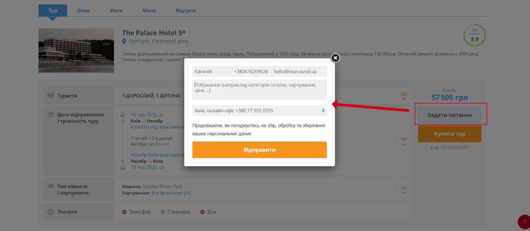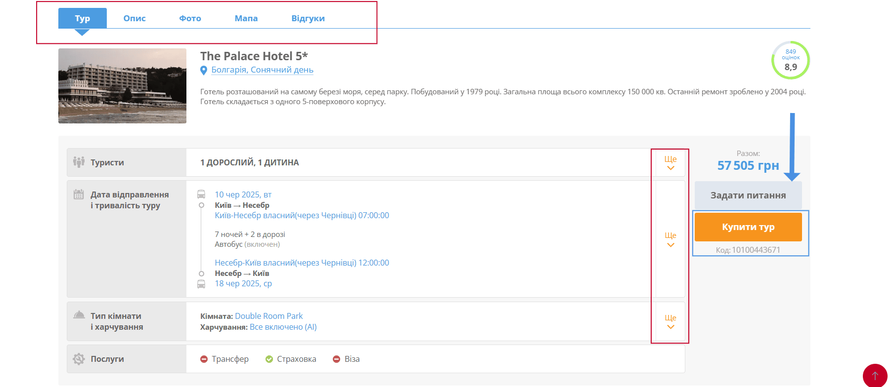 Вибравши тур – клікніть на вартість. На сторінці з готелем ознайомтеся з описом, перегляньте фотографії або вивчіть карту і відгуки туристів. Тут можна поміняти кількість туристів, подивитися календар низьких цін в залежності від дат вильоту і тривалості ночей. Порівняйте ціни на інші номери або типи харчування.